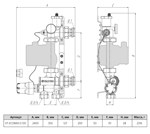 Насосно-смесительный узел Valtec VT.ECOMIX.0.130, без насоса 130 мм предназначенд для создания в системе отопления здания циркуляционного контура с пониженными параметрами теплоносителя относительно источника тепловой энергии.