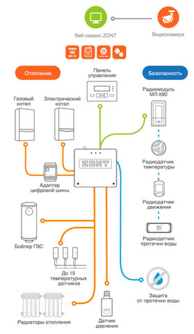 | Функции охраны и безопасности | подключение датчиков протечки воды, утечки газа, дыма, влажности и др. |